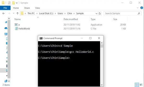 Pasul 2: Aceasta include deschiderea CMD sau linia promptă de comandă și navigarea la directorul în care este prezent fișierul HelloWorld.c. Aici este prezent în C:UtilizatoriChinEșantion .