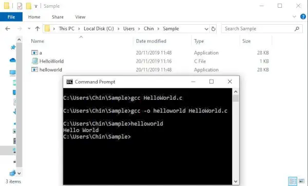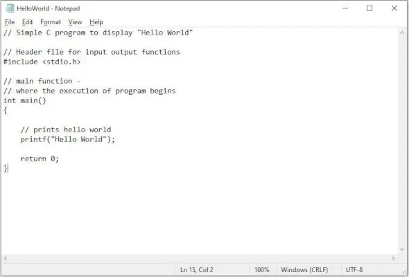 Înainte de a continua la scrierea primului program, utilizatorul trebuie să configureze un compilator de program C, care ar compila și executa programul Hello World. Aici am folosit un compilator GCC bazat pe Windows pentru a compila și a rula programul. Pentru a afla mai multe despre cum să configurați compilatorul GCC local sau să rulați folosind ide online, consultați Setarea mediului de dezvoltare C .