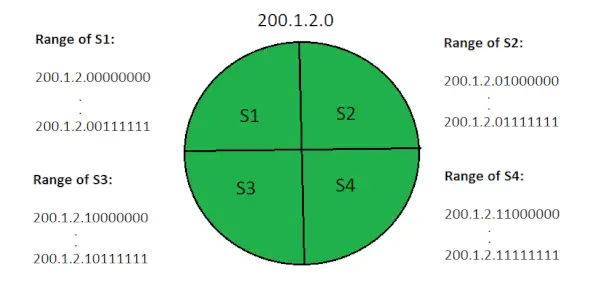 Luați în considerare că o rețea este subrețea în 4 subrețele, așa cum se arată în imaginea de mai sus. Adresa IP a celor 4 subrețele sunt: